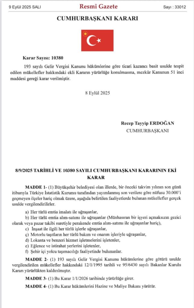 9 Eylül 2025 tarihli Resmî Gazete’de yayımlanan Cumhurbaşkanı kararı, küçük esnafı doğrudan etkileyecek önemli bir değişikliği beraberinde getirdi. Karara göre, nüfusu 30 bini aşan ilçelerde basit usulde vergilendirme 1 Ocak 2026 itibarıyla kaldırılacak. Bu tarihten itibaren esnaflar gerçek usulde vergilendirmeye tabi olacak.