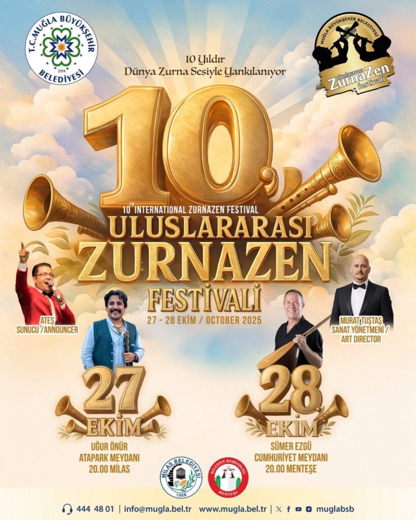 Dünya’da ve Türkiye’de ilk olma özelliği taşıyan Uluslararası Zurnazen Festivali’nin 10’uncusu bu yıl Milas ve Menteşe’de düzenlenecek. Dünyanın farklı ülkelerinden gelen sanatçılar, 27 Ekim’de Milas Atapark Meydanı’nda, 28 Ekim’de ise Menteşe Cumhuriyet Meydanı’nda sahne alacak.