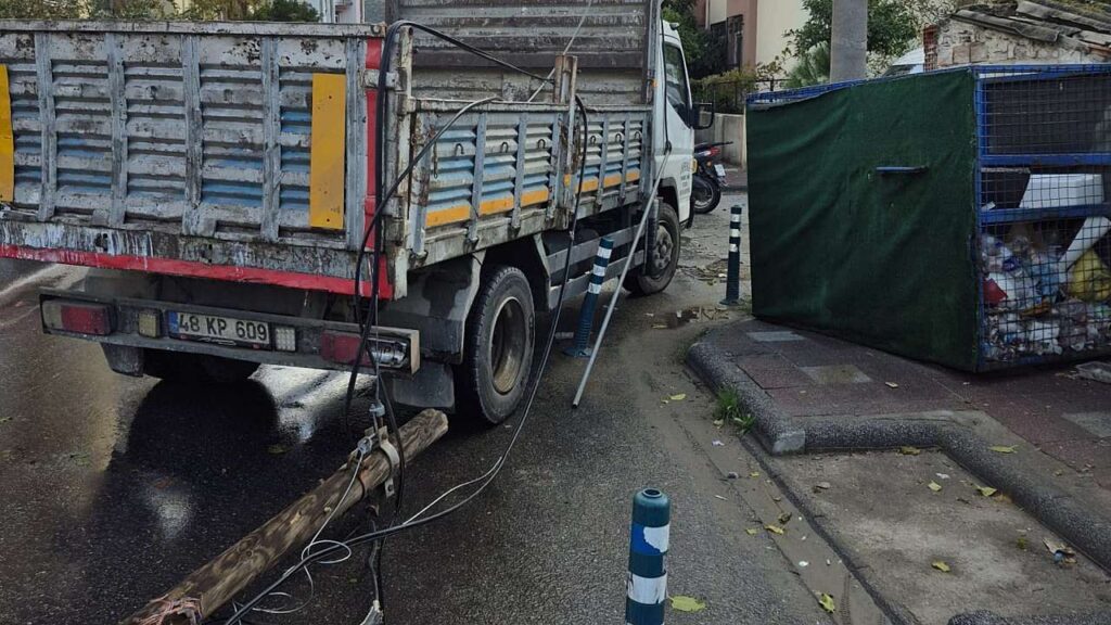 Muğla’nın Milas ilçesine bağlı Emek Mahallesi’nde meydana gelen kazada, bir kamyonetin kasasının telefon direklerine takılması sonucu direkler devrildi. O esnada yoldan geçen bir motosiklet sürücüsü, devrilen direğe çarparak yaralandı.
