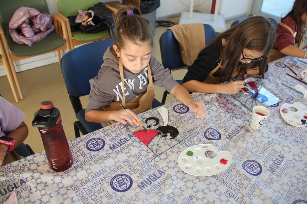 Atölyede Atatürk baskılı vitray ve el baskı çalışmaları yapıldı. Çocuklar, hazırladıkları eserlerle Ata’ya olan sevgilerini ve Cumhuriyet’e duydukları bağlılığı sanat yoluyla ifade etti.