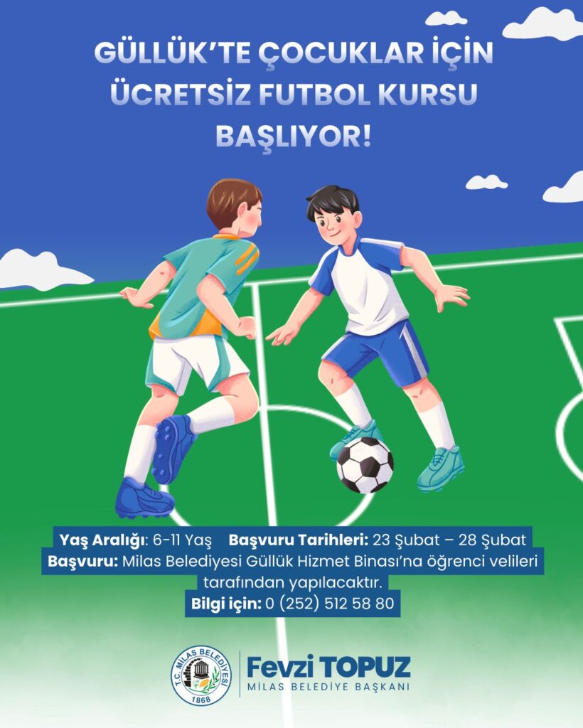 6–11 yaş arası çocukların katılabileceği futbol kursları ücretsiz olarak gerçekleştirilecek. Kontenjanın sınırlı olduğu kurslara kayıt yaptırmak ve detaylı bilgi almak isteyen vatandaşlar, Milas Belediyesi Güllük Hizmet Binası’na başvurabilecek ya da 0 (252) 512 58 80 numaralı telefonu arayabilecek.