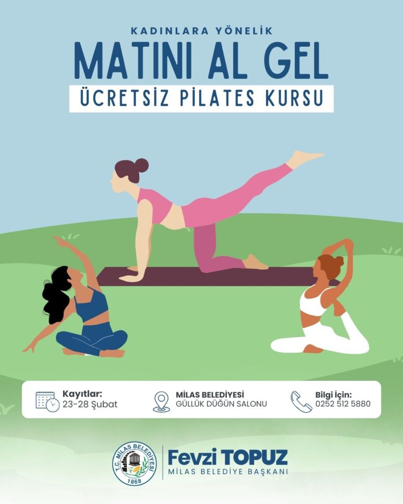 Milas Belediyesi, Güllük Mahallesi’nde kadınlara yönelik ücretsiz pilates kursu başlatıyor. Başvurular 23–28 Şubat tarihleri arasında alınacak.